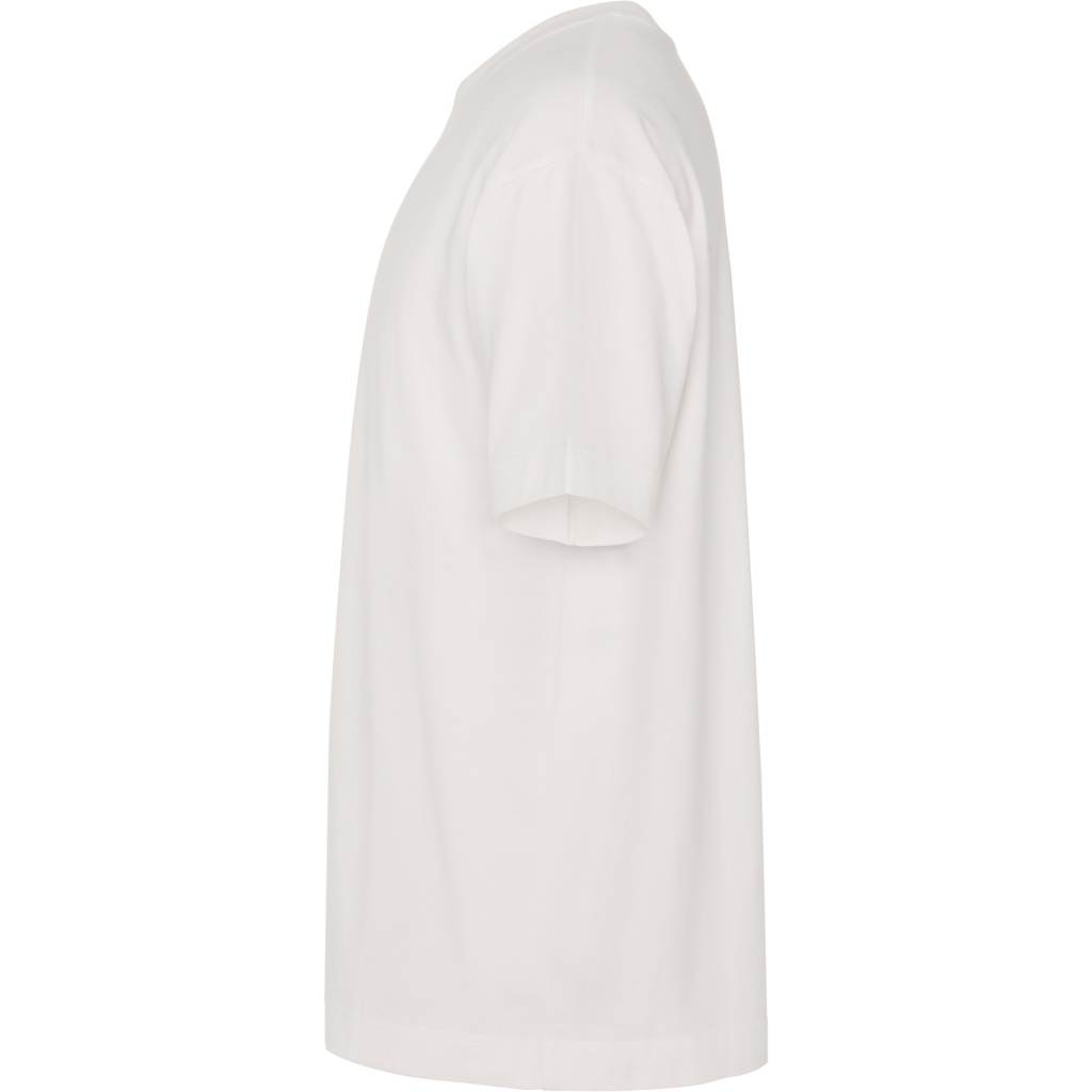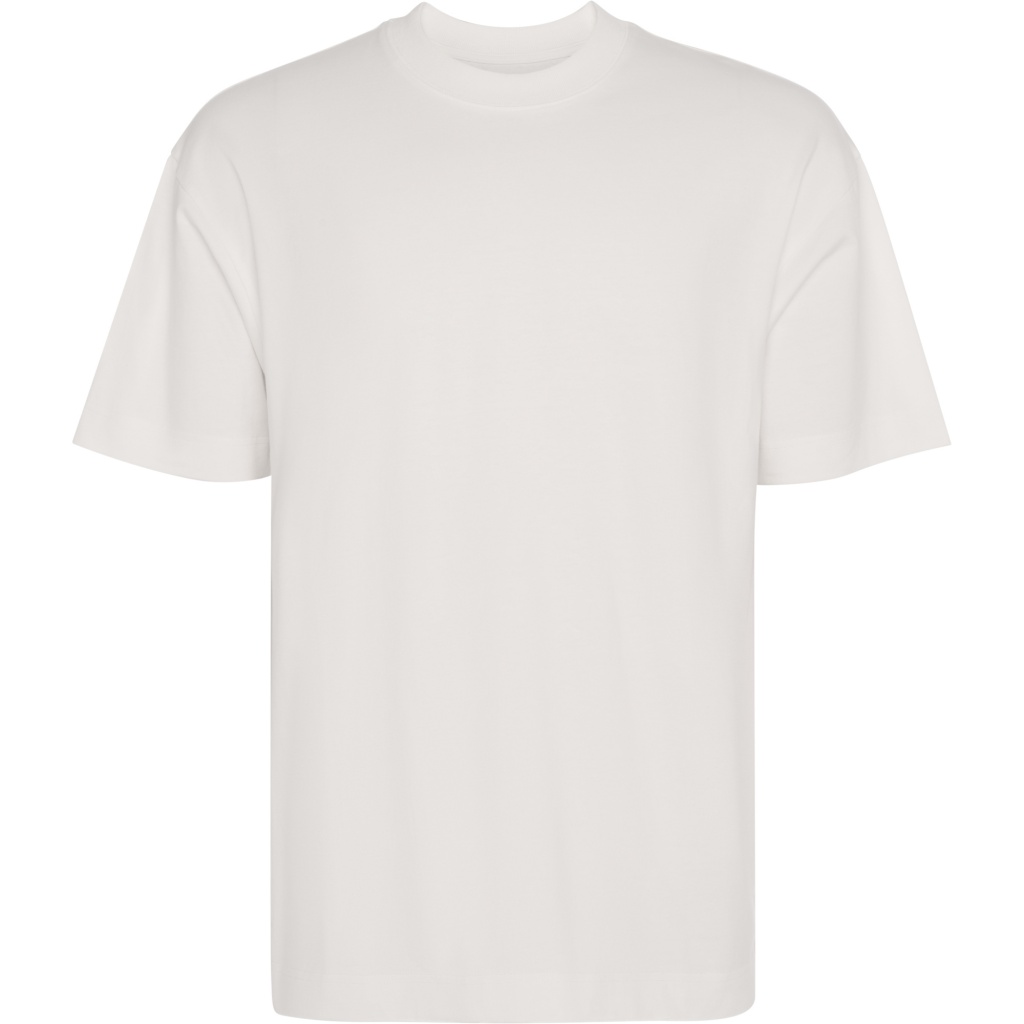 Gruba koszulka oversize z krótkim rękawem. Szeroki, prążkowany, okrągły dekolt 2x1. Taśma kryjąca przeszycie na karku z pasującej tkaniny. Szerokie podwójne szwy na rękawach i obszyciu.