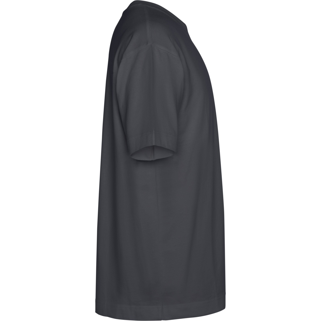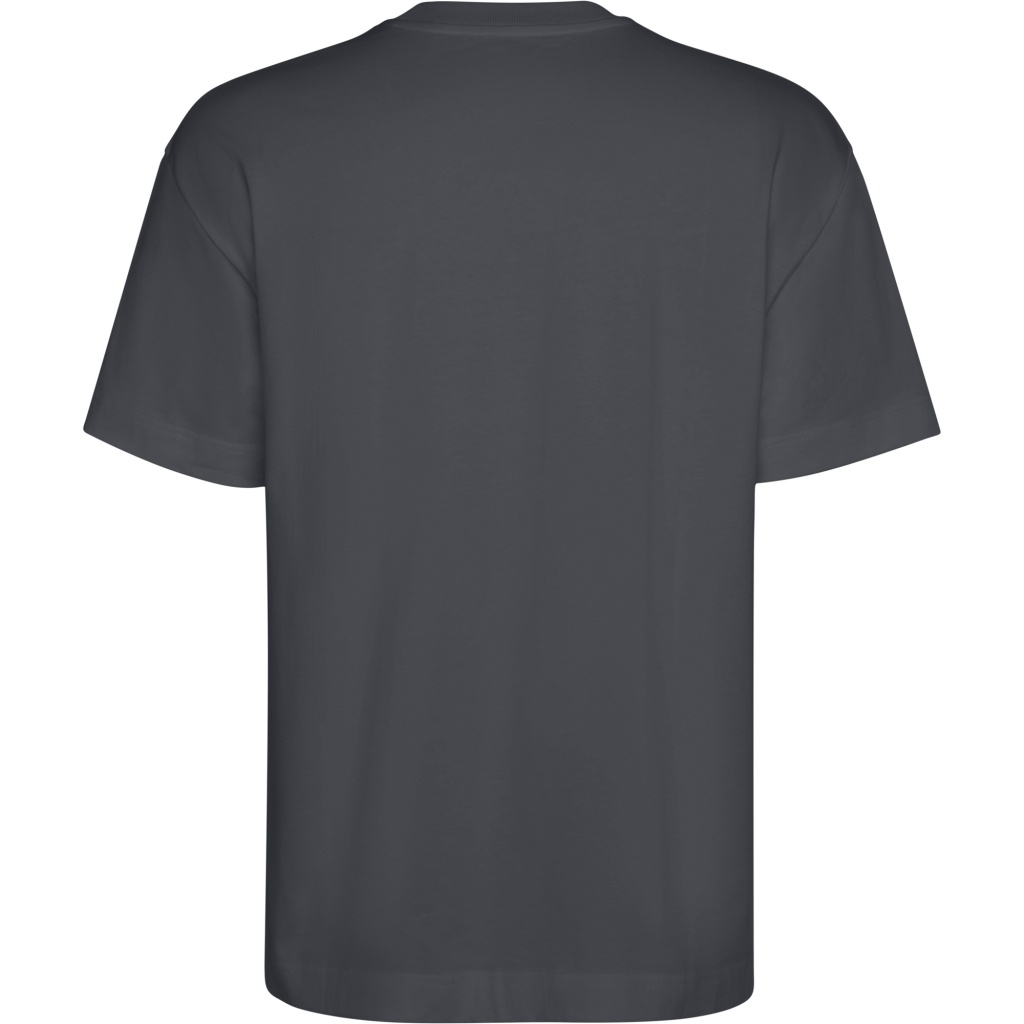 Gruba koszulka oversize z krótkim rękawem. Szeroki, prążkowany, okrągły dekolt 2x1. Taśma kryjąca przeszycie na karku z pasującej tkaniny. Szerokie podwójne szwy na rękawach i obszyciu.