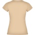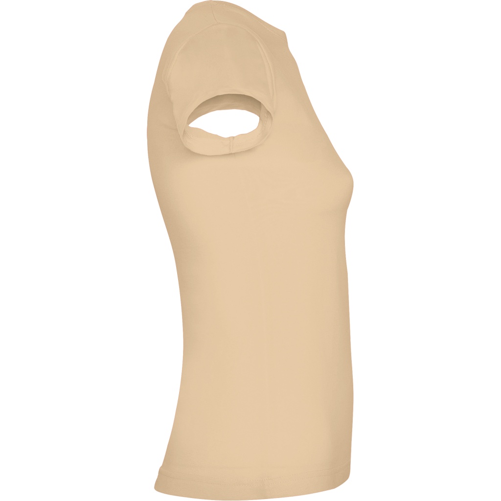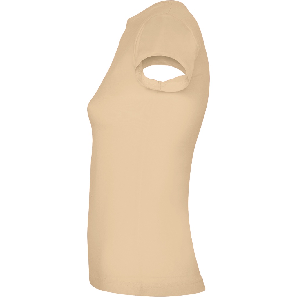Dopasowana koszulka damska. Zaokrąglony, Dwuwarstwowy ściągacz przy szyi, typowo damski fason. Wzmocnione, kryte szwy przy kołnierzyku i na ramionach, szwy boczne.