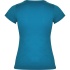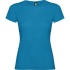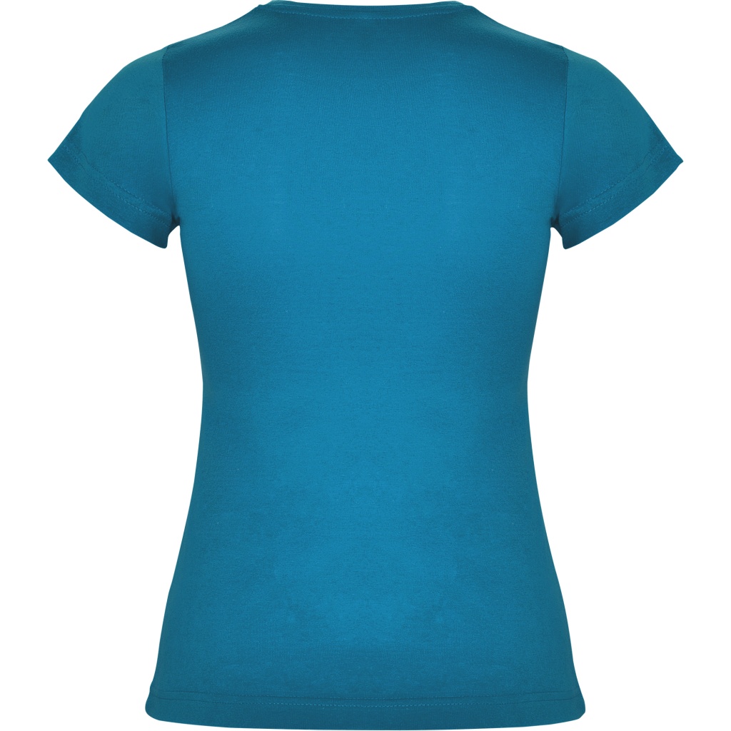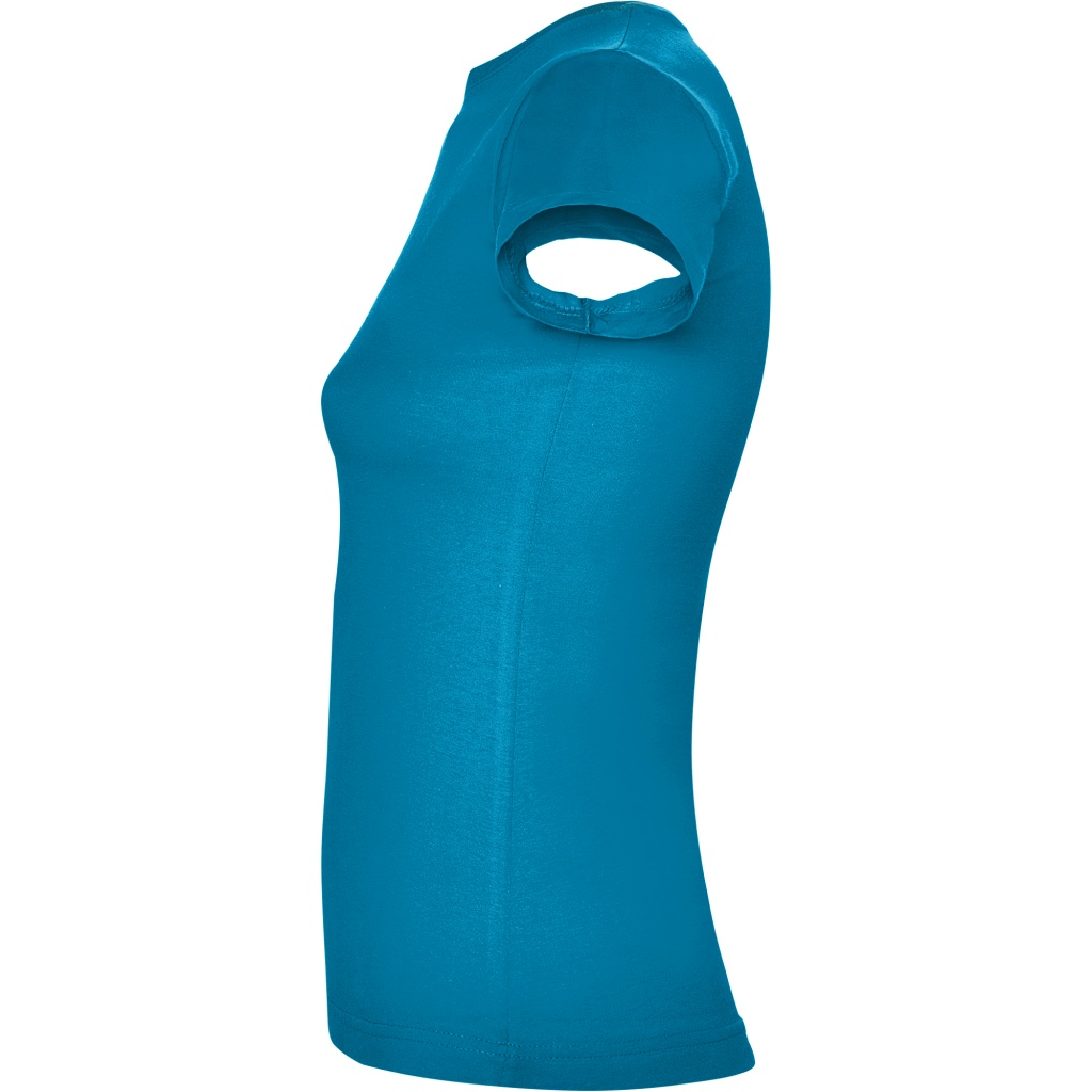 Dopasowana koszulka damska. Zaokrąglony, Dwuwarstwowy ściągacz przy szyi, typowo damski fason. Wzmocnione, kryte szwy przy kołnierzyku i na ramionach, szwy boczne.