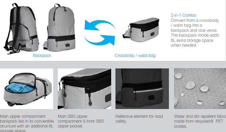 Combo to torba 2 w 1, wykonana z wysokiej jakości materiałów pochodzących z recyklingu butelek PET. Torebkę można przekształcić z torby crossbody / biodrowej w plecak, dodając 6 litrów dodatkowej przestrzeni do przechowywania w razie potrzeby. Combo to idealna torba na wakacje, do szkoły, na siłownię, do pracy lub po prostu na cały dzień.